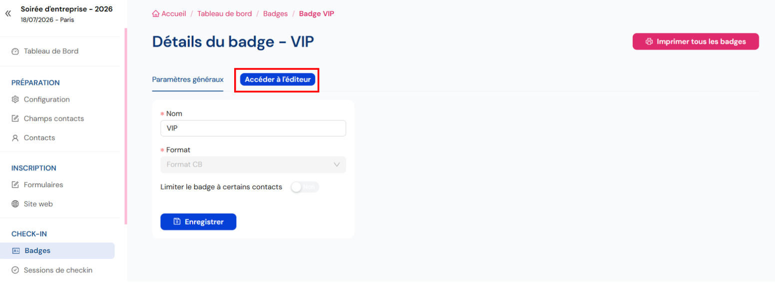 Cliquez sur “Accéder à l’éditeur” pour éditer votre badge :