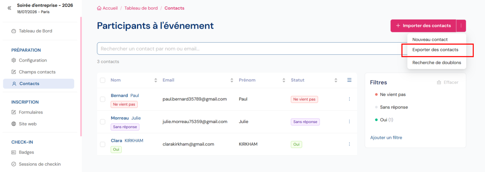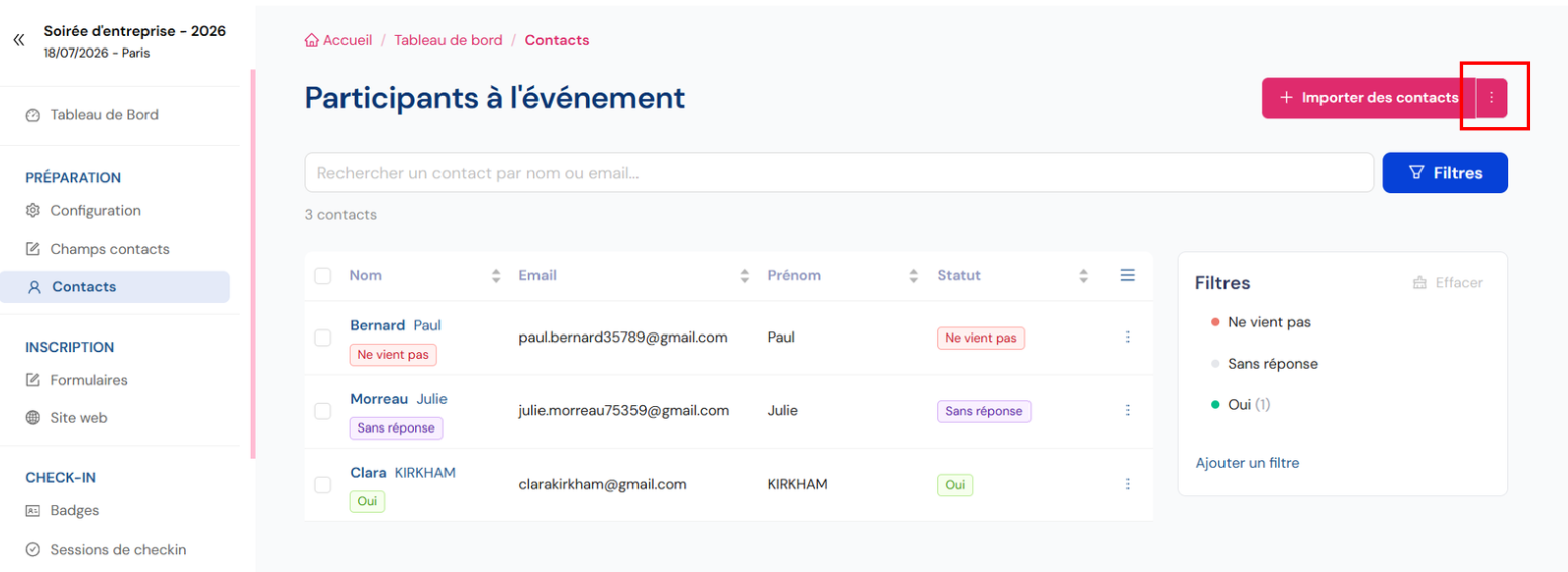 A. Import et export Excel (pc) Import Excel Rendez-vous sur l’événement souhaité. Dans le menu, allez dans l’onglet “Contacts” Cliquez en haut à droite sur le bouton “importer des contacts” Sélectionnez votre fichier (.xlsx, .xls ou CSV /taille ...