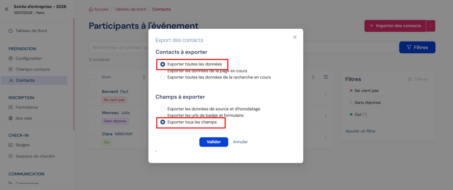 - Sélectionnez les contacts et les champs à exporter, puis valider :