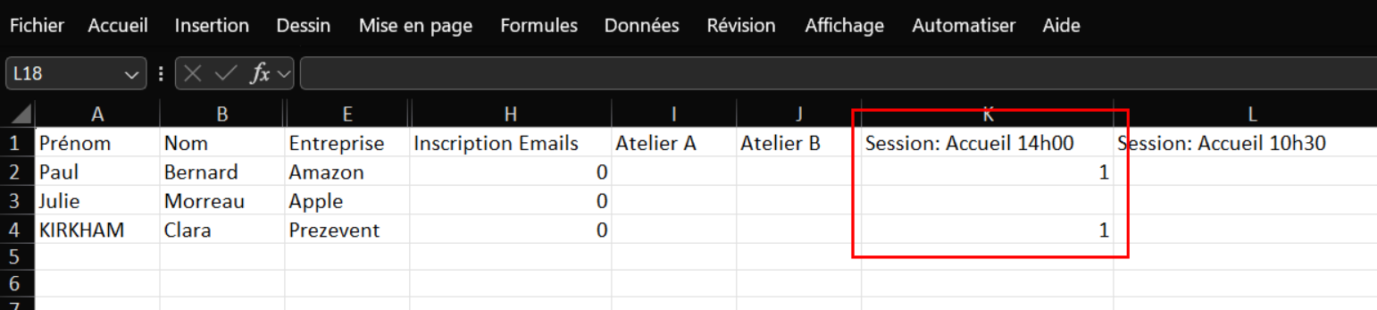 Remarque : Pour voir les personnes émargées, vous retrouverez un "1" pour une présence. Si le champ est vide, l'invité n'a pas été émargé.