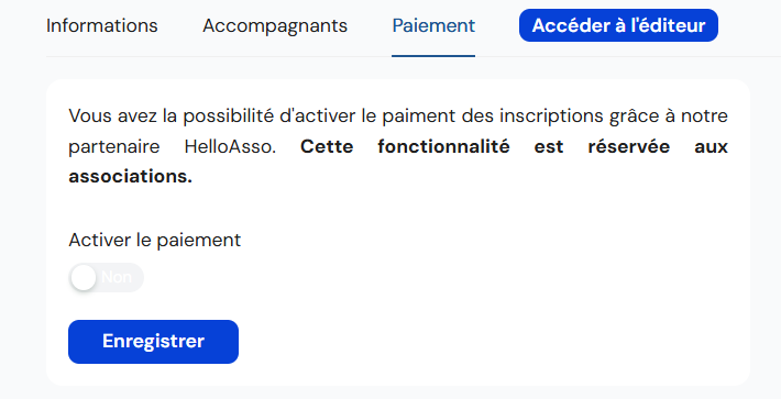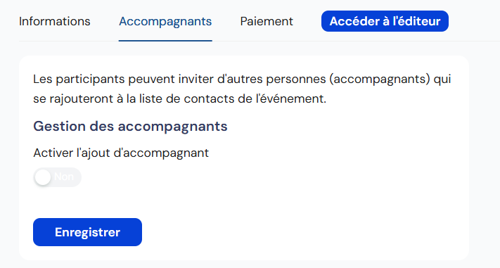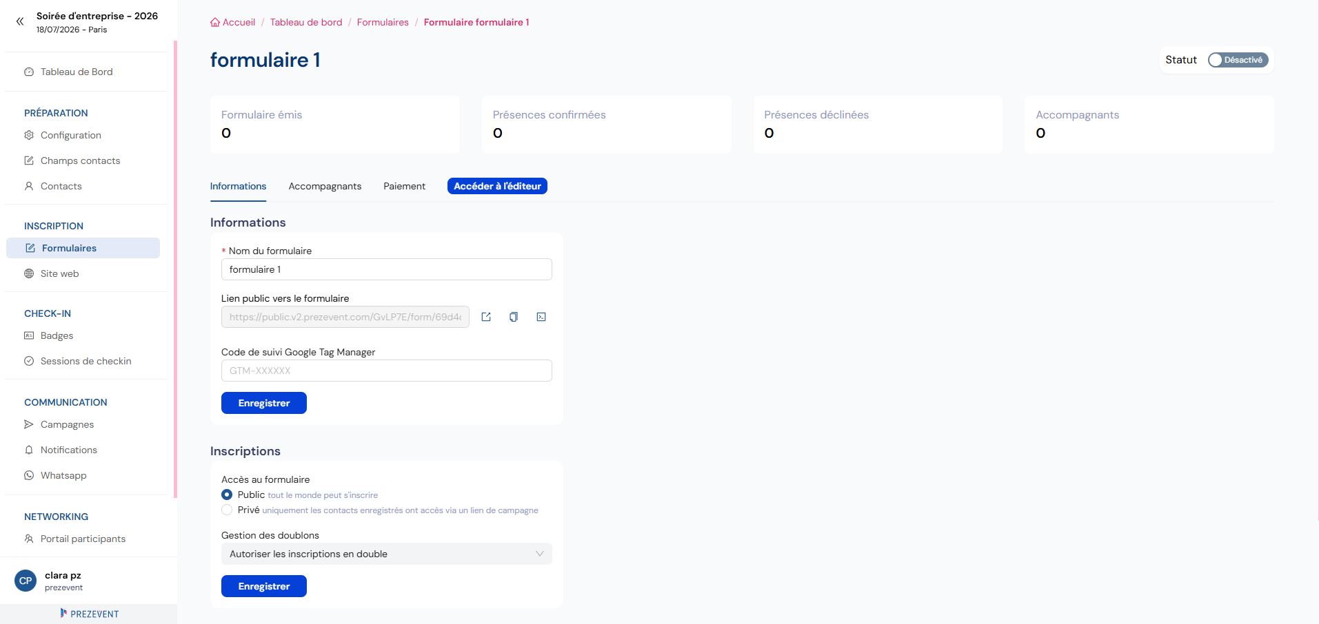 Si vous cliquez sur "Editeur", vous pourrez éditer votre formulaire grâce à notre éditeur Prezevent intégré à la plateforme :