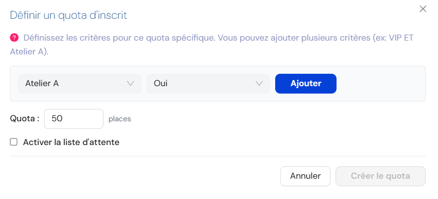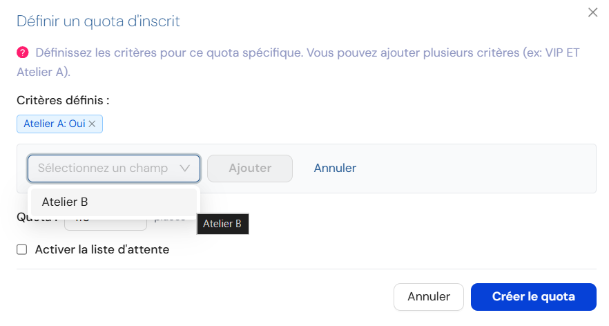 Par exemple, j'organise une conférence et je souhaite limiter les places aux ateliers A et B à 50 participants.
