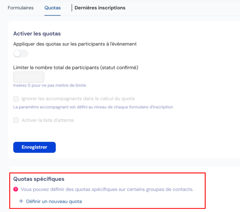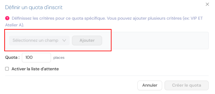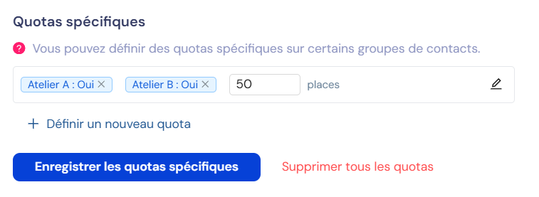 Les quotas spécifiques servent à ajouter des quotas à une catégorie de contacts selon les champs de contacts personnalisés :