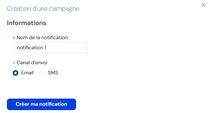 - Nommez votre notification et choisissez s'il s'agit d'une notification Email ou SMS :