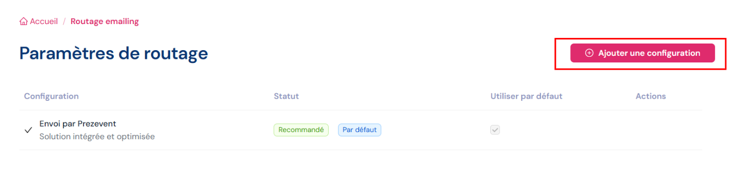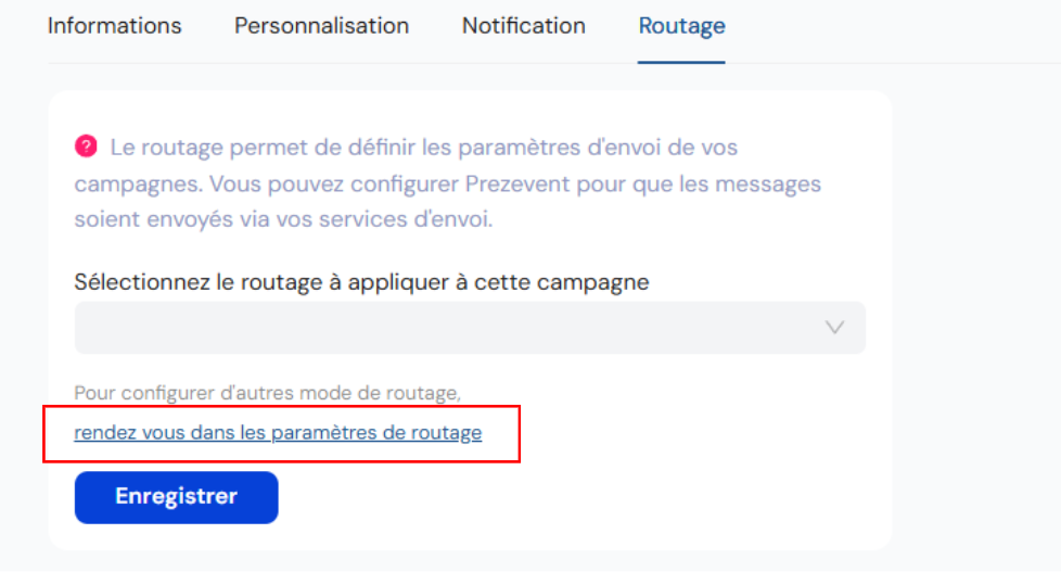 En cliquant sur "Routage", vous pouvez choisir le routage à appliquer à la campagne. Vous pouvez choisir celle de Prezevent mais vous pouvez aussi ajouter votre propre routage en cliquant sur "rendez vous dans les paramètres de routage" :