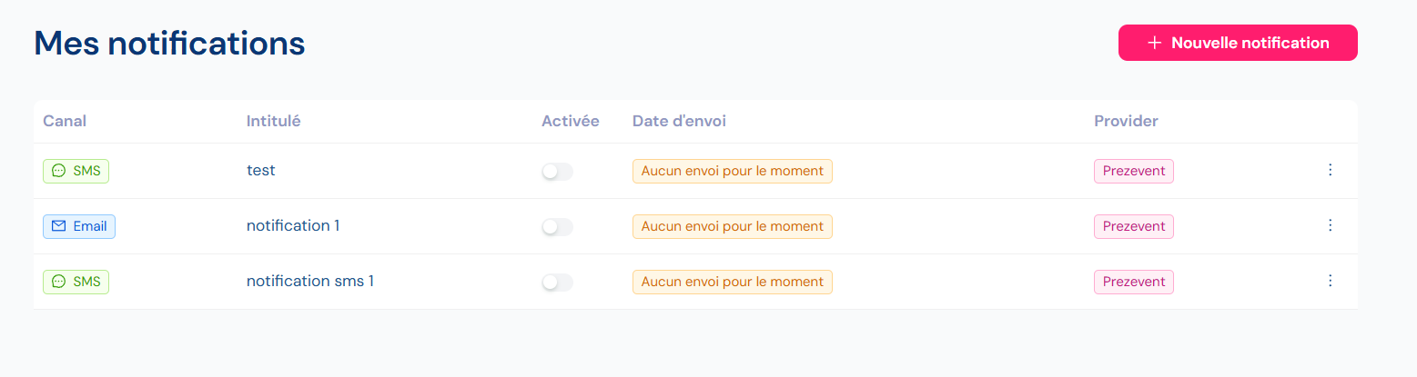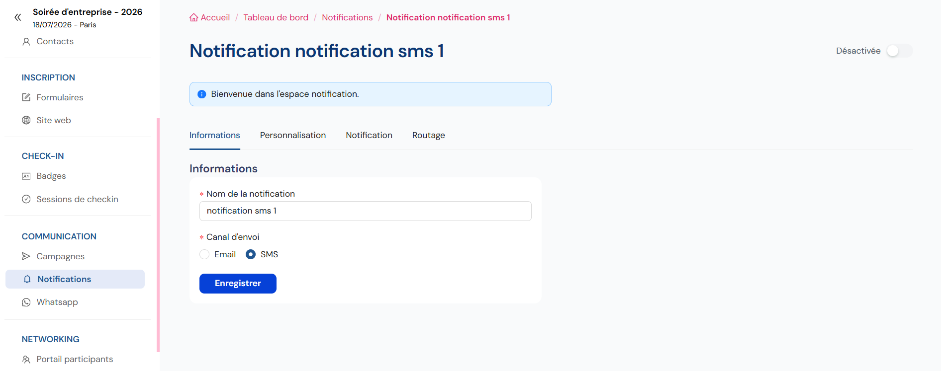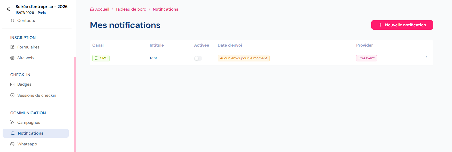 En cliquant sur "Notification", vous pourrez configurer l'envoi de votre SMS :