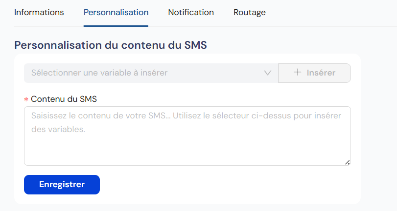 En cliquant sur "Personnalisation", vous pourrez rédiger le contenu du SMS :