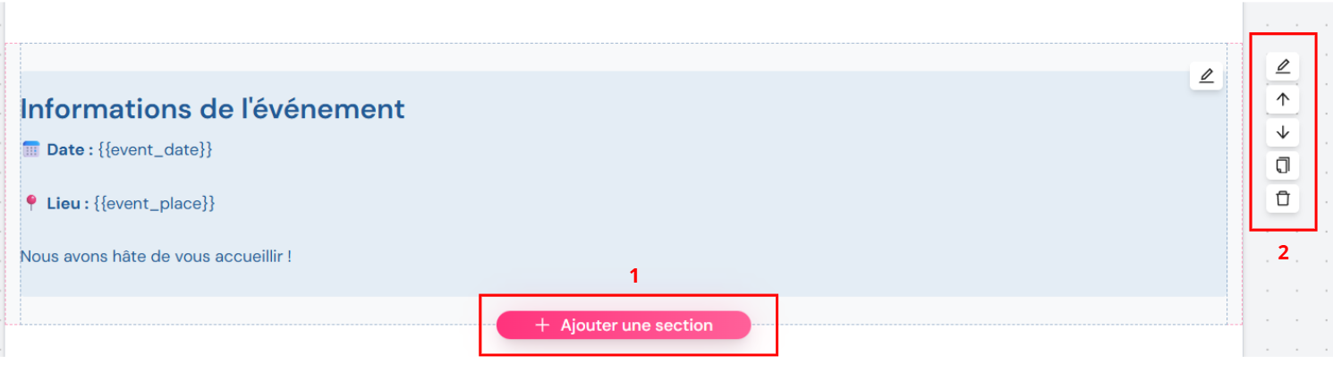 Vous pouvez ajouter (1), déplacer/modifier/supprimer/dupliquer les sections (2) :