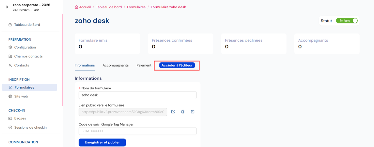 A. Création d'un formulaire Pour créer un formulaire : Cliquer sur “ Ajouter un formulaire” : Ajouter un nom à votre formulaire puis cliquez sur “Créer le formulaire” : Vous arriverez directement sur le paramétrage du formulaire : Vous pouvez activer ...
