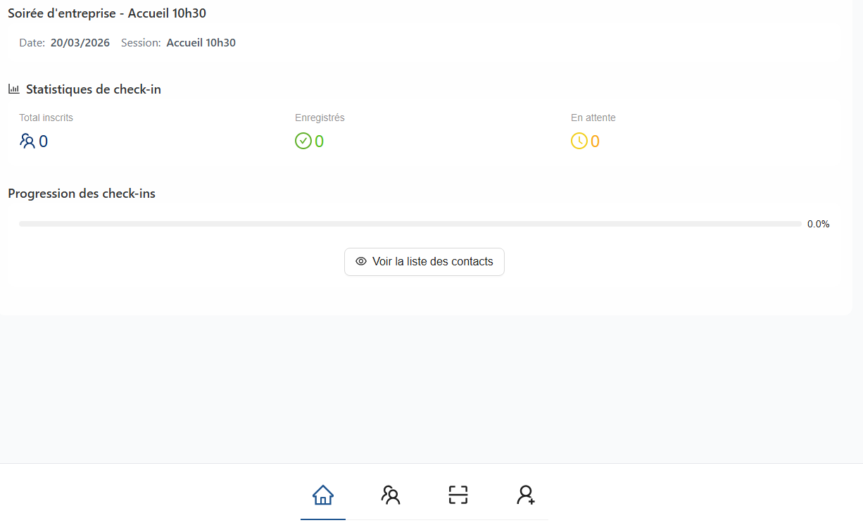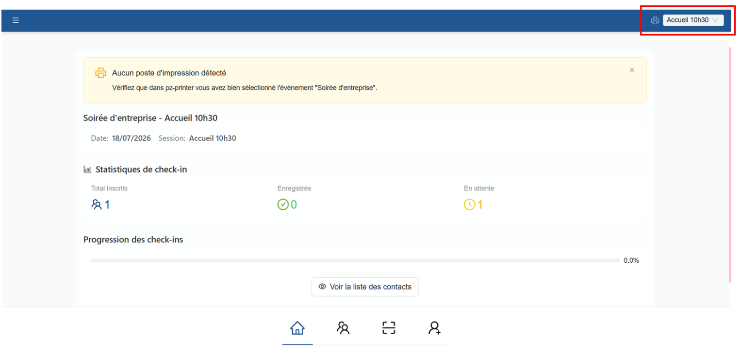 Remarque : Vous pouvez changer de session de check-in directement en haut à droite (tant qu’il s’agit d’un même événement) :
