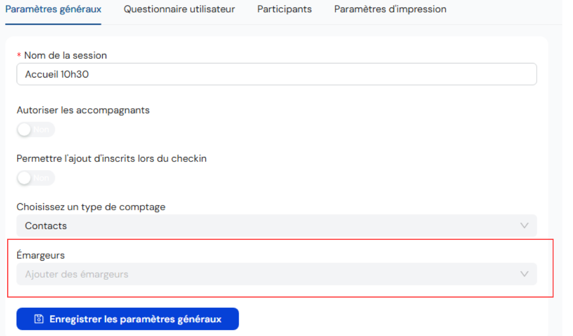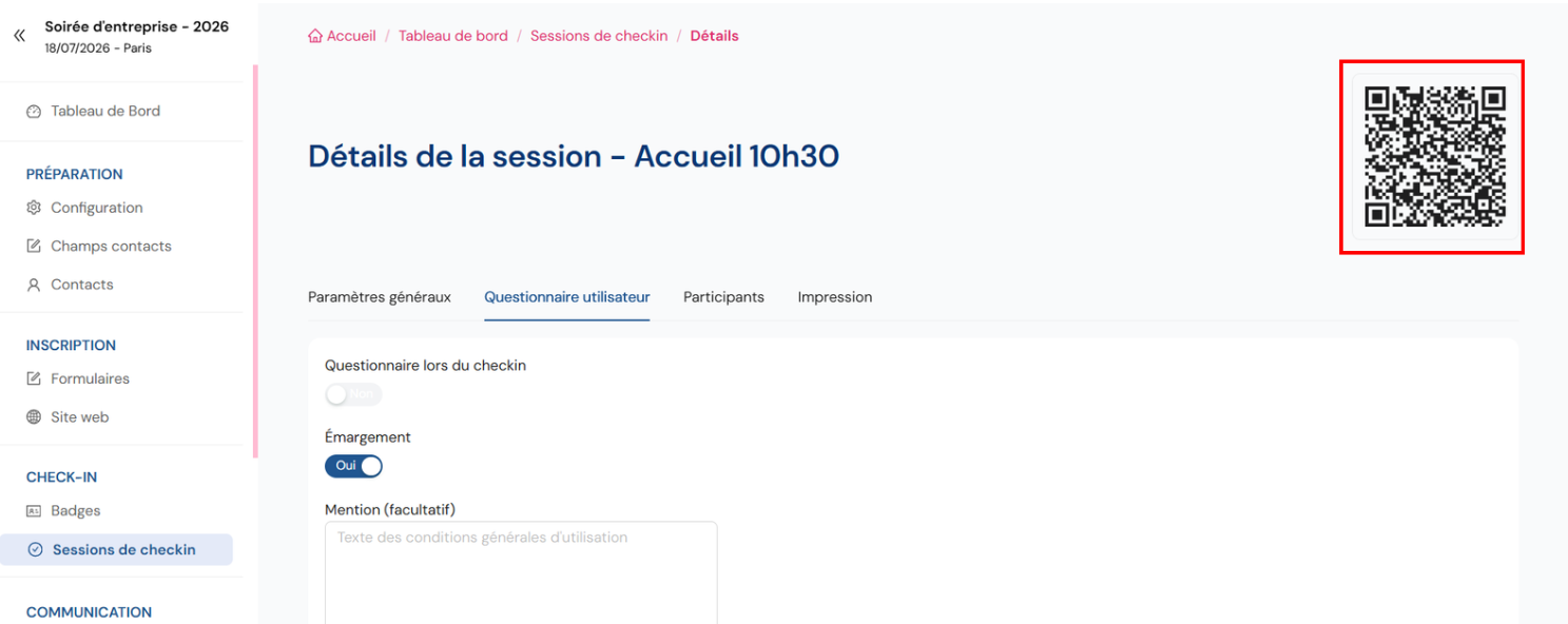 Remarque : Le code émargeur permet aux hôtes/staff d'accéder à la session d'émargement.