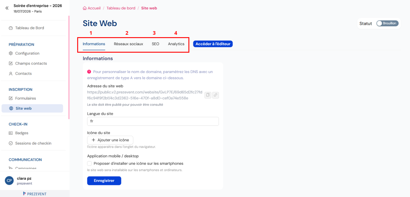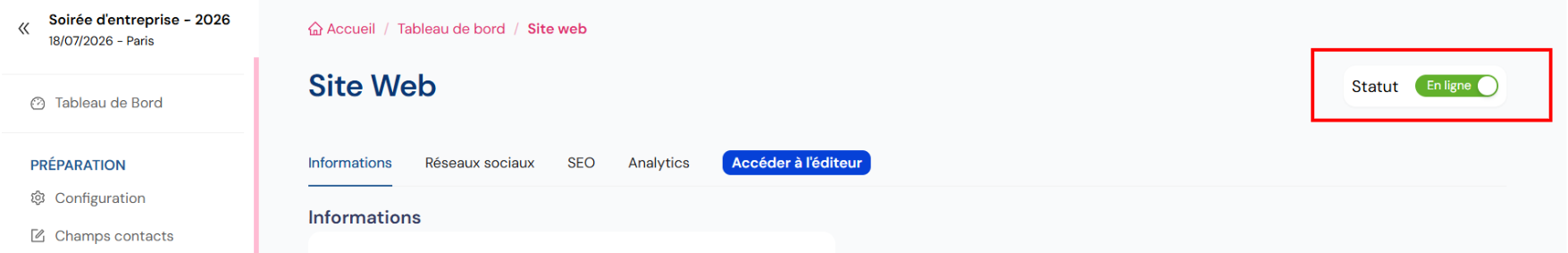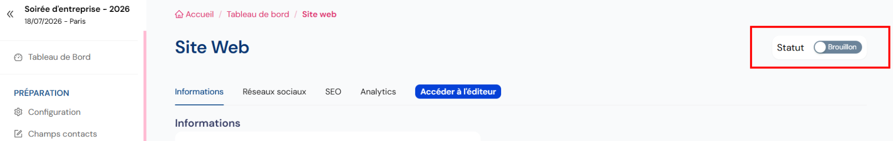 Pour activer le site web, changer le statut de "Brouillon" à 'En ligne" :
