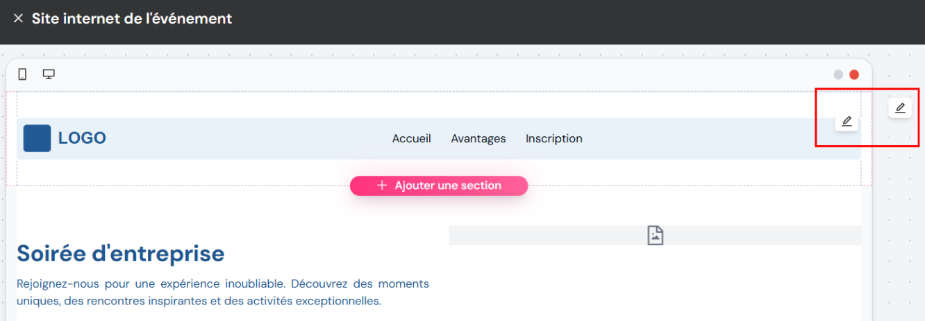 Si vous passez votre souris sur une section, vous pouvez voir un logo "modifier" :
