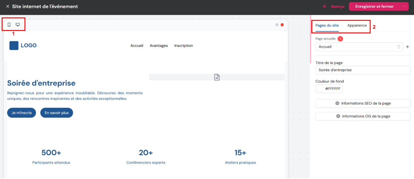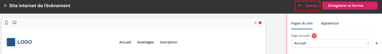 Remarque : Vous pouvez avoir un aperçu avant de mettre en ligne le site web en cliquant sur "Aperçu" dans l'éditeur de site web :